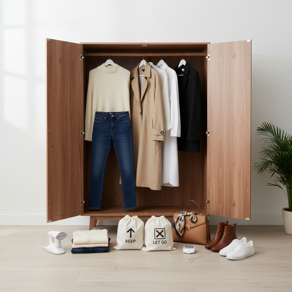 Ištraukite absoliučiai visus drabužius, batus ir aksesuarus iš savo spintos. Kiekvieną daiktą įvertinkite kritiškai: ar šis drabužis man tinka ir patinka? Ar aš jį dėvėjau bent kartą per pastaruosius dvylika mėnesių? Ar jis yra geros būklės? Suskirstykite viską į tris kategorijas: tai, ką paliekate; tai, ką reikia taisyti ar atiduoti į valyklą; ir tai, su kuo atėjo laikas atsisveikinti (parduoti, padovanoti ar atiduoti perdirbimui). Pasilikite tik tuos drabužius, kurie idealiai tinka jūsų figūrai, kuriuos apsivilkę jaučiatės pasitikintys savimi ir kuriuos galite lengvai derinti tarpusavyje. Tokiu būdu spintoje liks tik tie daiktai, kurie iš tiesų tarnauja jūsų asmeniniam stiliui, o rytinis rengimosi procesas taps greitas ir malonus.