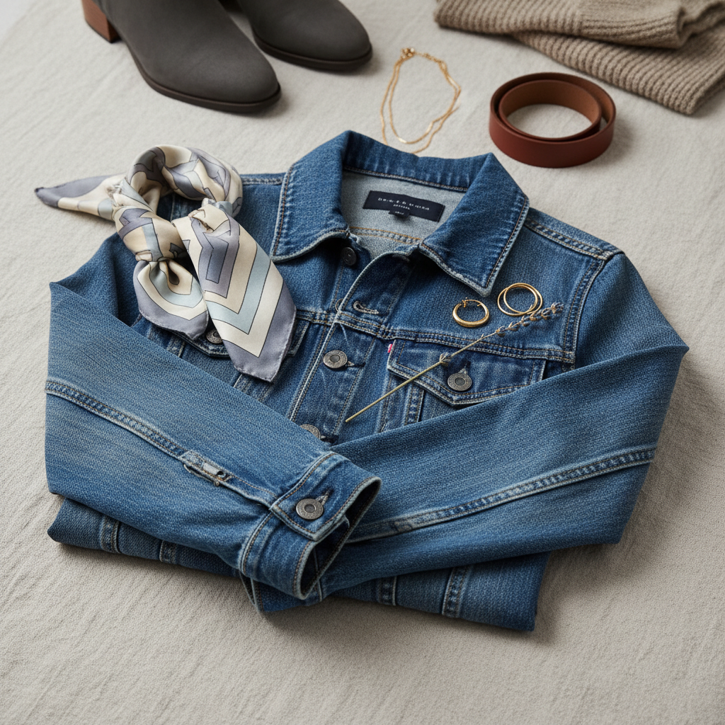 Aksesuarų srityje džinsinis švarkas tiesiog reikalauja papildomų akcentų. Šilkinės skarelės, užrištos ant kaklo, suteikia paryžietiško šarmo ir sušvelnina kietą džinso audinį. Taip pat puikiai atrodys masyvūs aukso spalvos papuošalai – stambios grandinėlės, dideli auskarai-žiedai. Jie sukuria prabangos kontrastą su paprastu kasdieniu drabužiu. Nepamirškite ir paties švarko personalizavimo galimybių – ant apykaklės ar kišenių prisegtos stilingos sagės, emalio ženkliukai ar net juosmens srityje užrištas odinis diržas gali paversti jūsų švarką vienetiniu dizaino kūriniu.