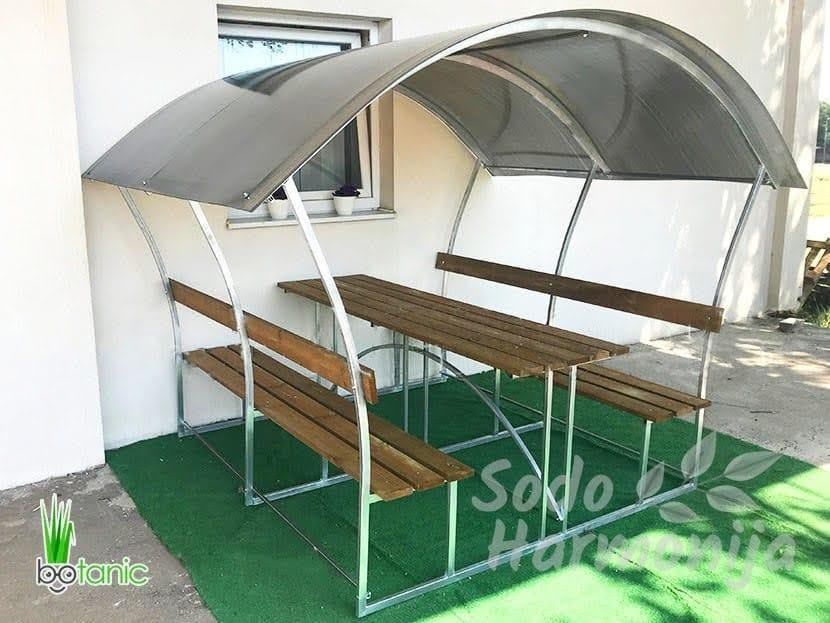 Ne visiems reikia didelės konstrukcijos. Kartais daug praktiškesnis sprendimas yra mažesnė, bet iš karto funkcionali pavėsinė. Tokiu atveju verta atkreipti dėmesį į modelius kaip pavėsinė ASTRA (ilgis 3 m). Šis variantas turi integruotą stalą ir suolus, todėl nereikia papildomų baldų. Ilgis siekia 3 metrus, plotis apačioje – 1,85 m, o konstrukcija iš cinkuoto vamzdžio užtikrina stabilumą.
