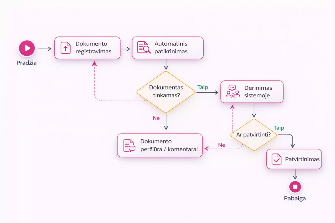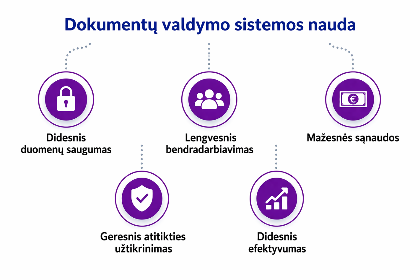 Būtent todėl dokumentų valdymo sistema tampa svarbiu įrankiu. Ji ne tik pakeičia popierių, bet ir sukuria aiškią, kontroliuojamą struktūrą.