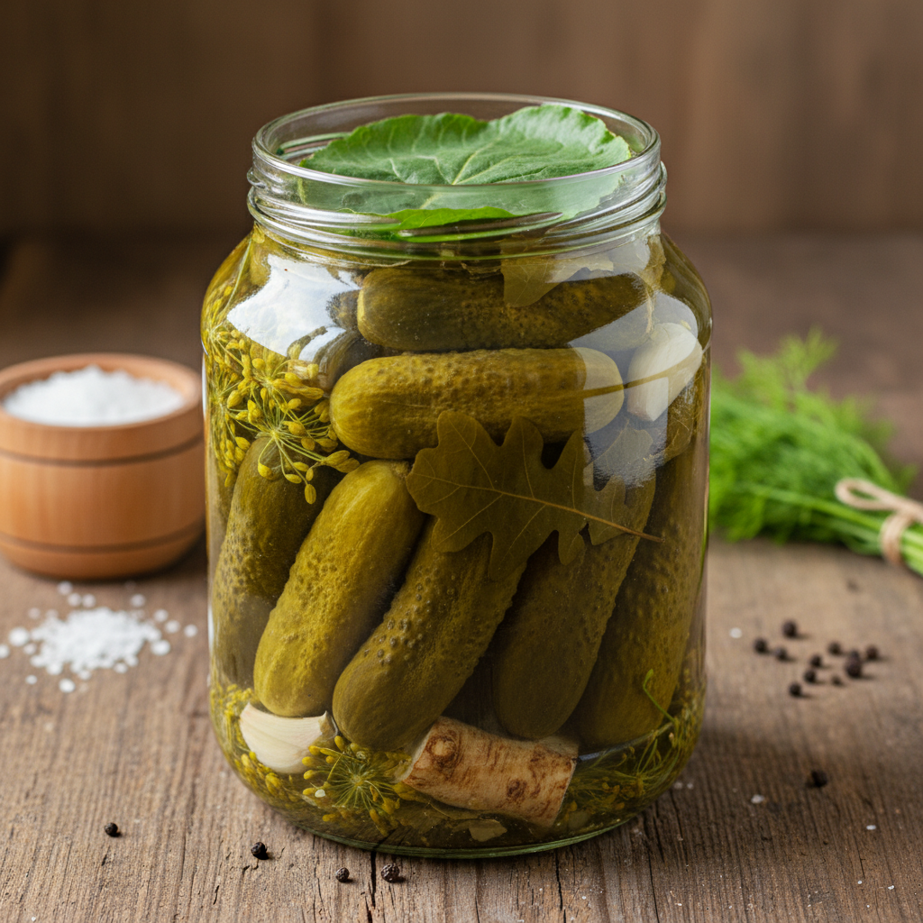 - Ąžuolo lapai: Tai vienas stipriausių ir natūraliausių taninų šaltinių mūsų gamtoje. Įdėjus vos kelis švarius ąžuolo lapus į stiklainį, agurkai įgaus ypatingo tvirtumo ir malonaus, vos juntamo miško aromato. Svarbu nepadauginti – vienam trijų litrų stiklainiui visiškai pakanka 2–3 lapų, kitaip agurkai gali tapti per kieti ar net įgauti specifinį kartumą.