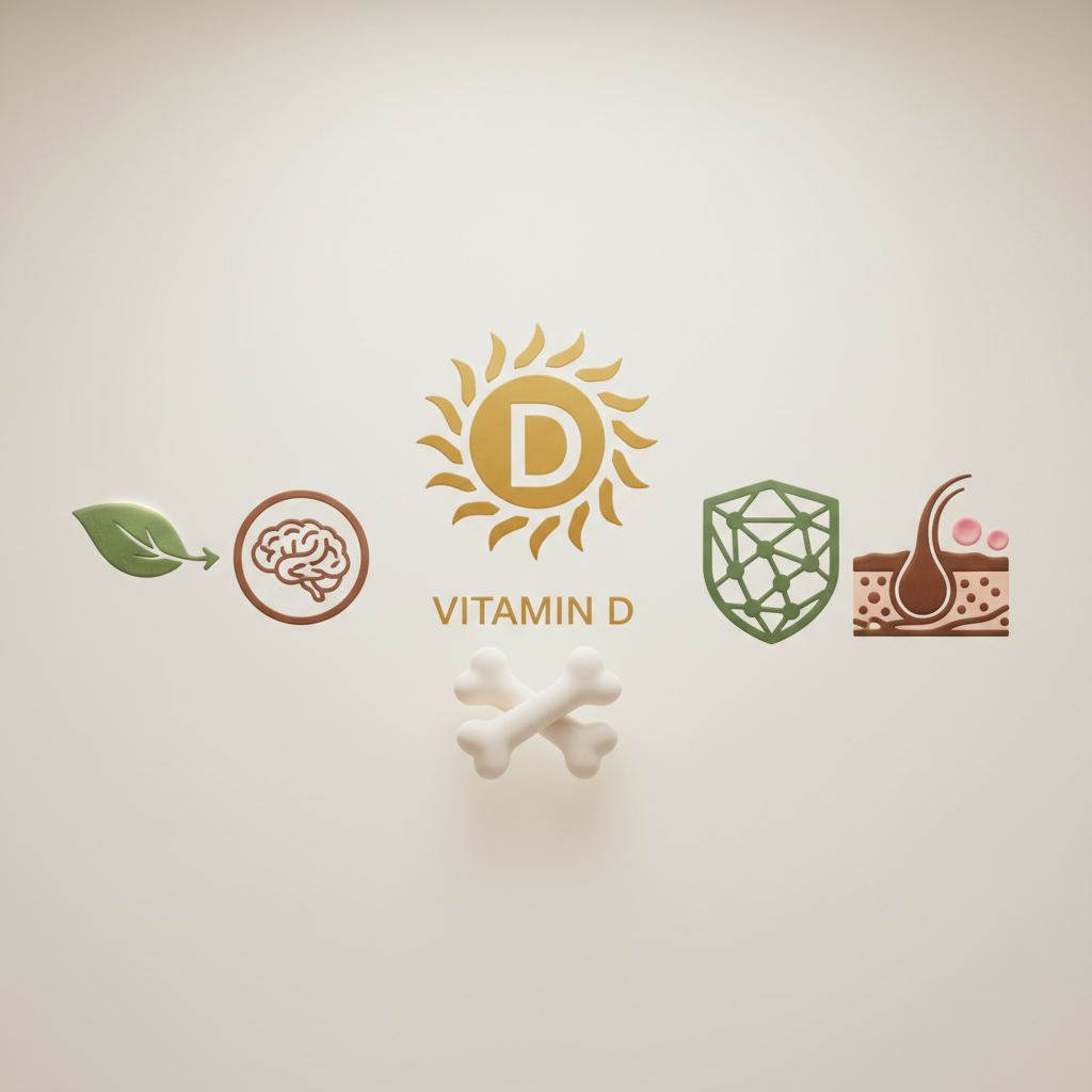 Šis esminis vitaminas atlieka gyvybiškai svarbų vaidmenį palaikant kalcio ir fosforo absorbciją plonajame žarnyne. Kai jo trūksta, organizmas patiria kalcio badą ir priverstinai pradeda imti šį mineralą tiesiai iš jūsų kaulų, kad palaikytų gyvybiškai būtiną jo kiekį kraujyje. Tai ilgainiui veda prie kaulų tankio mažėjimo (osteopenijos, o vėliau ir osteoporozės), o trumpalaikėje perspektyvoje suaugusiems pasireiškia kaip bukas, varginantis, giliai viduje jaučiamas kaulų skausmas (osteomaliacija). Be to, funkcinis raumenų silpnumas, ypač jaučiamas didžiuosiuose raumenyse – šlaunų, dubens ar pečių lanko srityse – gali gerokai apsunkinti elementarias kasdienes veiklas, pavyzdžiui, lipimą laiptais, sunkesnių pirkinių nešimą ar net atsikėlimą iš žemos kėdės.